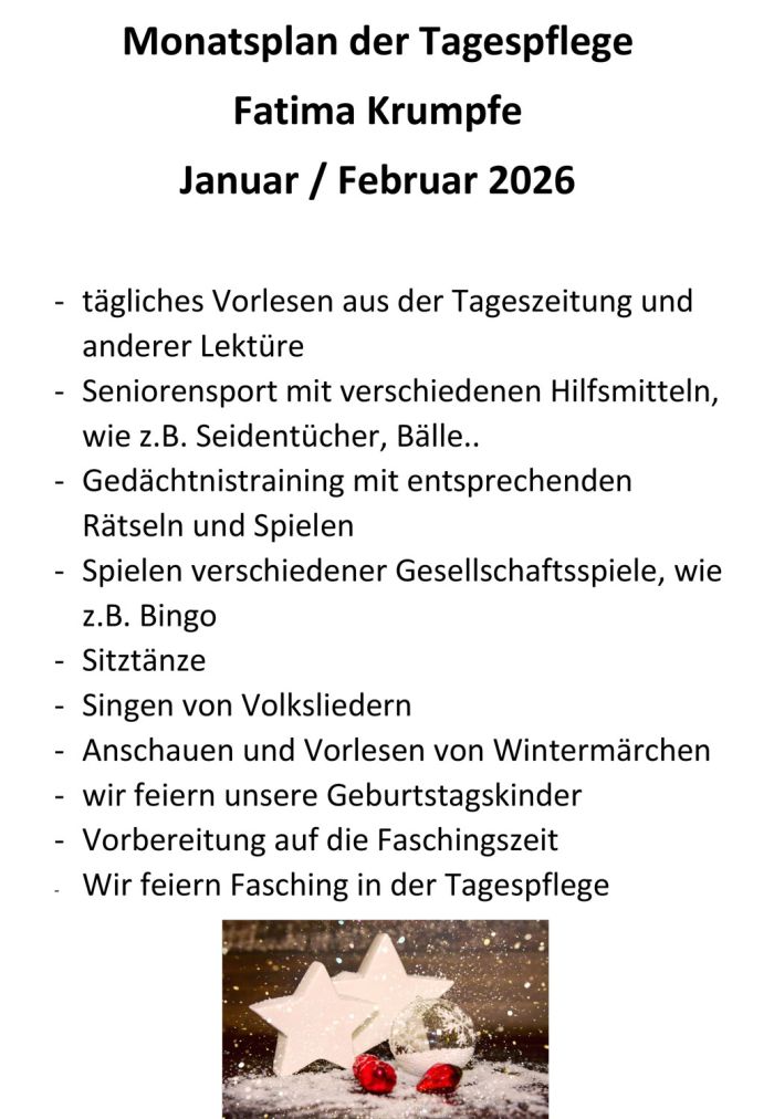 Im September 2014 eröffnete in der Elbresidenz die Tagespflege Fatima Krumpfe. Bei uns können die Patienten tagsüber, für mehrere Stunden, betreut werden. Mit unserer Arbeit greifen wir nicht nur das gesundheitspolitische Ziel -Tagespflege vor stationär-, sondern wir entsprechen dem Wunsch der Pflegebedürftigen, so lange wie möglich in der gewohnten Umgebung zu bleiben und am Tag in unserer Tagespflege betreut zu werden.
